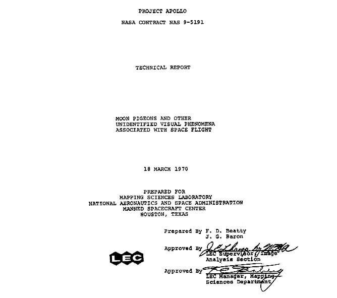 Tato zpráva předkládá výsledky obrazové analýzy neidentifikovaného objektu pozorovaného miliony diváků během televizního přenosu z mise Apollo 12. Vizuální jevy spojené s kosmickými lety byly pozorovány již dříve. Pozitivní identifikace těchto objektů je obvykle dosažena prostřednictvím analýzy jejich obrazů zaznamenaných na film, je-li k dispozici. Často však pozitivní identifikace není možná a je nutné provést „předběžnou“ interpretaci. „Moon Pigeon“ je termín zavedený konstrukčními inženýry MSC k označení neočekávaných objektů pozorovaných na provozních fotografiích, které vzdorují jednoznačné identifikaci. Následné letové plány misí obvykle zahrnují fotografické sekvence navržené tak, aby poskytly dostatečné informace pro identifikaci jevu, pokud by se znovu objevil.