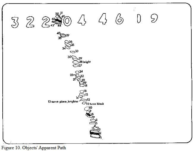 Obrázek 10 je diagram znázorňující dráhu objektu napříč obrazovou plochou. Tento diagram byl vytvořen sledováním obrazu objektu po jednotlivých snímcích při jeho postupu pomocí stop-motion projektoru. Analýza této skici ukazuje, že objekt je největší při prvním pozorování. V okamžiku, kdy mizí z dohledu podél východního okraje zobrazovacího formátu, má již pouze poloviční velikost.