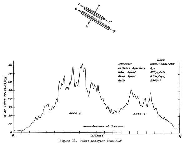 Na několika 16mm snímcích objekt působí, jako by byl složen ze dvou částí, případně jako rozdělený obraz způsobený odrazem v okně. K analýze zdánlivého dvojitého obrazu byla využita zařízení fotometrické skupiny Mapping Sciences Laboratory. Mikroanalyzátor Mann byl v transmisním režimu použit k provedení dvou podélných skenů a jednoho příčného skenu přes objekt (srovnej obrázky 12 a 2 a viz obrázek 13; obrázky 2 a 13 nejsou uvedeny). Příčný sken A-A1 neprokázal návrat k nejnižší pozorované úrovni propustnosti světla mezi dvěma jasnými oblastmi, což by bylo očekáváno, pokud by se jednalo o dva odlišné objekty. Tento jev však lze připsat halaci — „slévání“ dvou jasných oblastí na fotografické emulzi. Oblast 1 (obrázek 12) vykázala nižší úroveň propustnosti světla než oblast 2.
