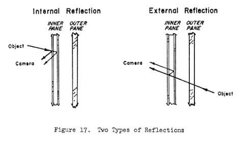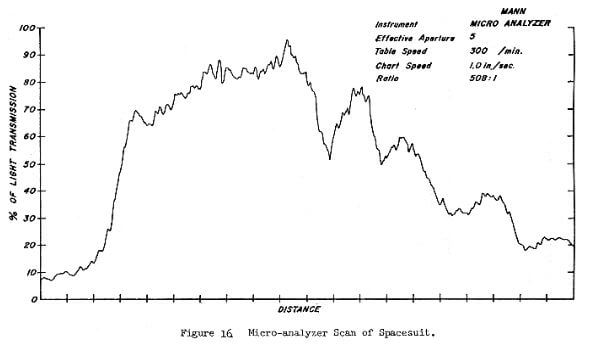 Navzdory skutečnosti, že okna obsahují antireflexní povlaky, jsou světelné podmínky takové, že odrazy interiéru kosmické lodi jsou často fotograficky zaznamenány. Pro analýzu byl vybrán snímek z 16mm filmových dat akviziční kamery zobrazující odrazy astronautovy paže (obr. 15). První odraz zaznamenává skafandr jako jasně bílý; druhý, méně jasný odraz z vnitřního povrchu okna je zaznamenán jako modrý. Tato scéna byla skenována mikroanalyzátorem Mann za účelem získání míry rozdílu přenášeného světla mezi oběma odrazy. Tento záznam (obr. 16) byl následně porovnán se skenem provedeným přes objekt na snímku č. 3 (obr. 12). Ačkoli výsledky nejsou a ani neměly být průkazné, jde o zajímavé srovnání. Zdá se, že první odrazová plocha propouští více světla než druhá; totéž by bylo očekáváno u neidentifikovaného objektu, pokud by byl rovněž odrazem.
